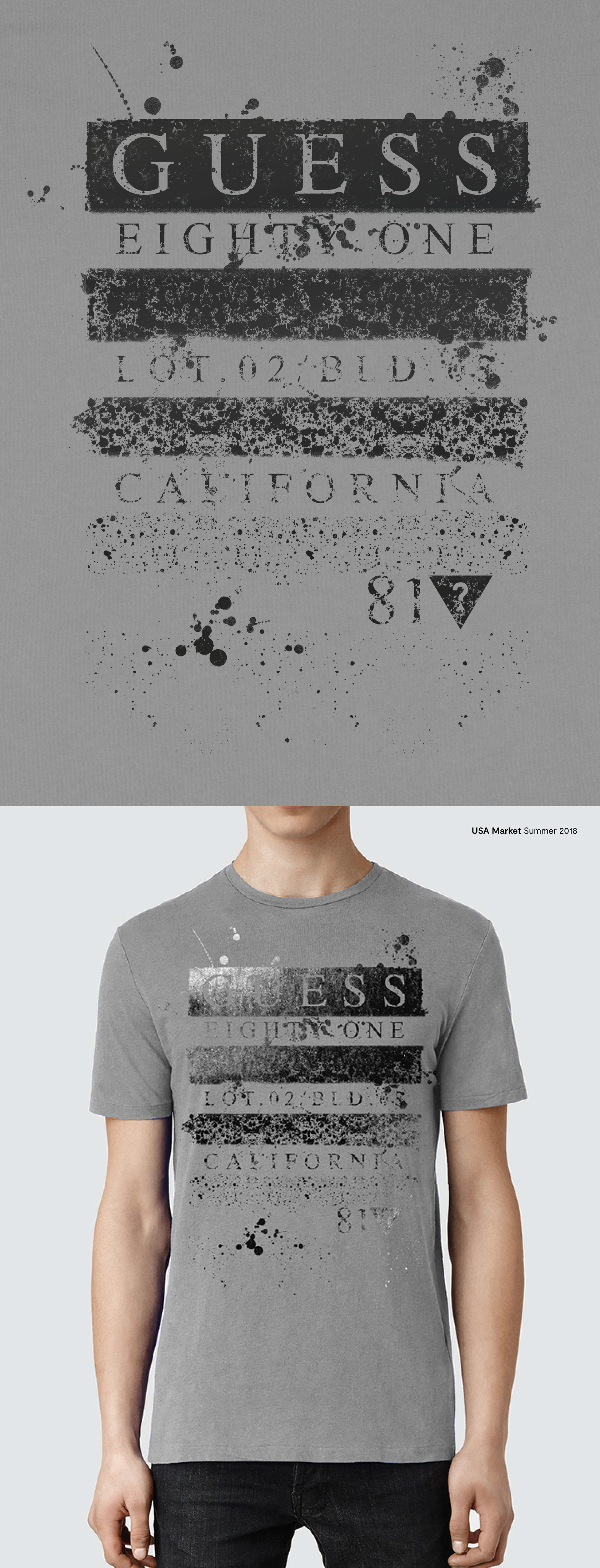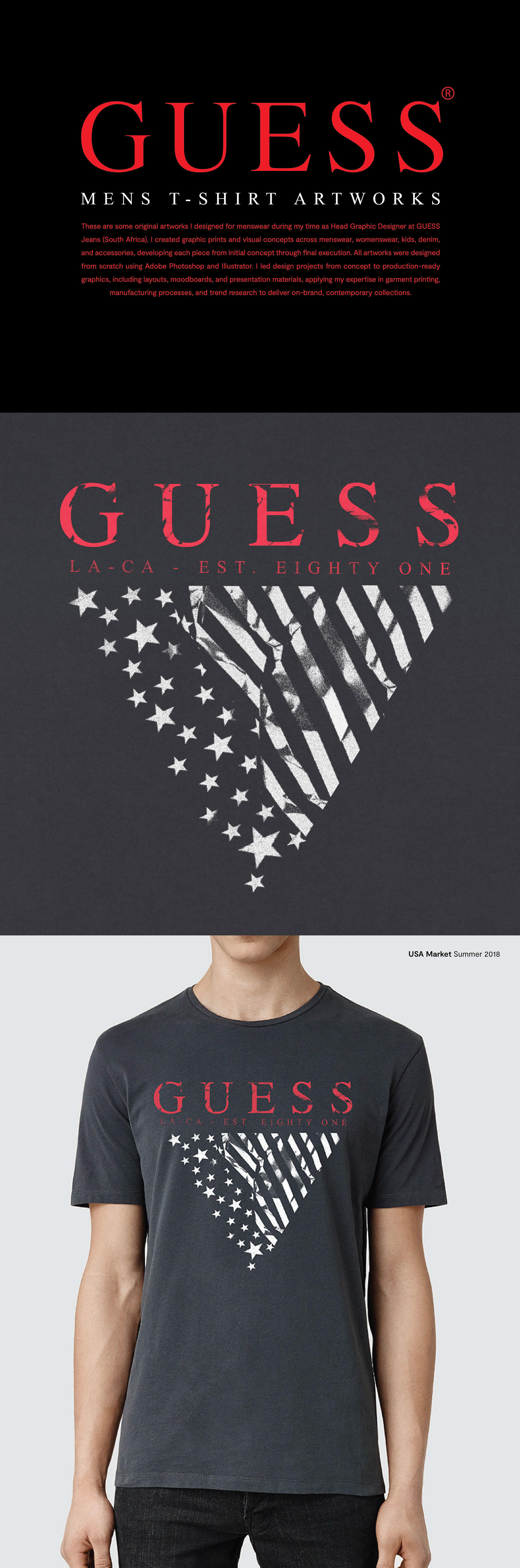 These are some original artworks I designed for menswear during my time as Head Graphic Designer at GUESS Jeans (South Africa). I created graphic prints and visual concepts across menswear, womenswear, kids, denim, and accessories, developing each piece from initial concept through final execution. All artworks were designed from scratch using Adobe Photoshop and Illustrator. I led design projects from concept to production-ready graphics, including layouts, moodboards, and presentation materials, applying my expertise in garment printing, manufacturing processes, and trend research to deliver on-brand, contemporary collections.